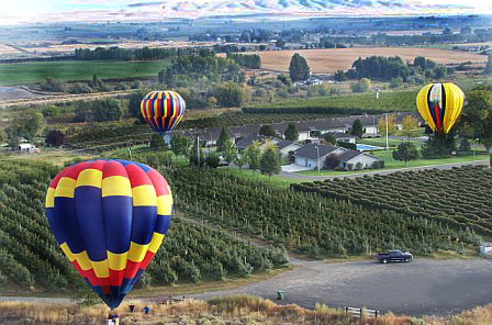 Hot air balloons over orchards and vineyards in Prosser Washington. Photo by Dawn Koch